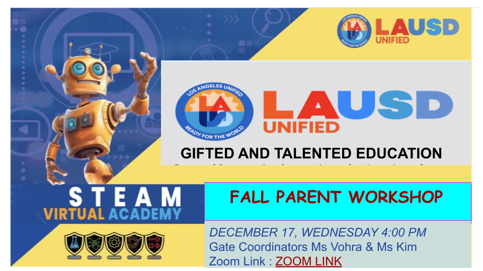 GATE Fall Parent Workshop December 17, 2025 4:00-5:00pm Workshop Link: https://lausd.zoom.us/j/5937938398?omn=82889535005